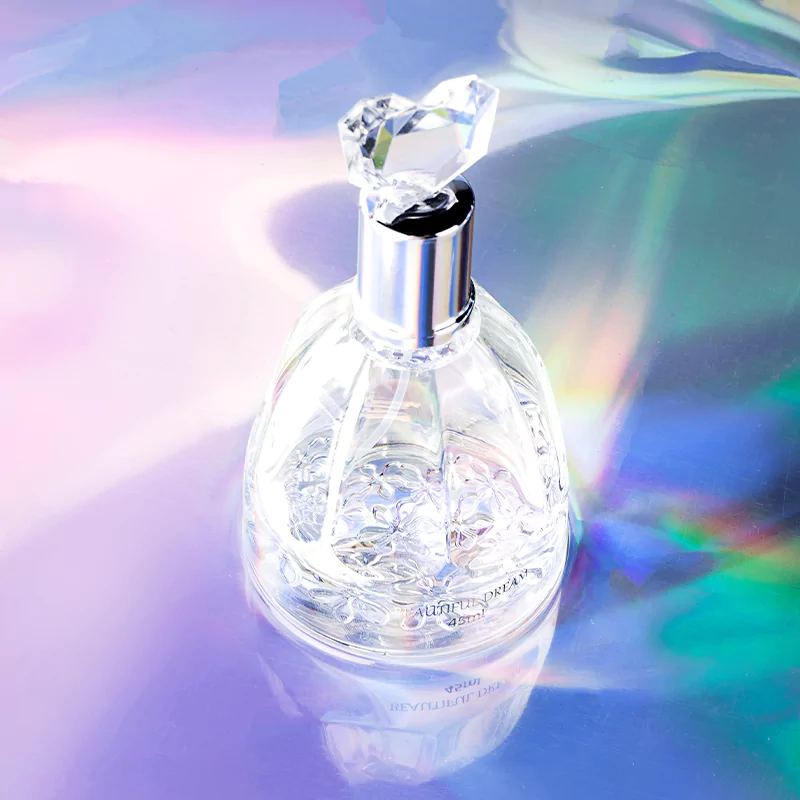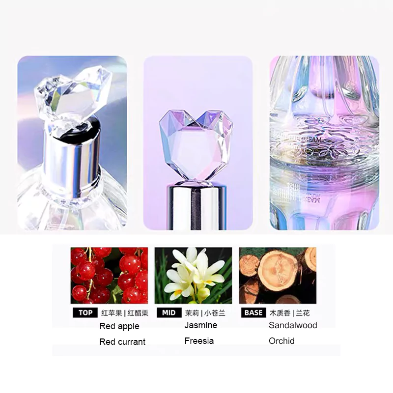 As the fragrance unfolds, the enchanting heart reveals the delicate floral harmony of jasmine and freesia, wrapping you in an elegant embrace.