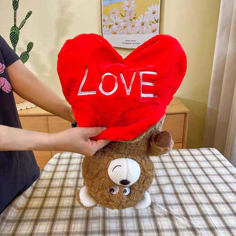 There's a zipper on the bear's back. Unzipping and flipping the bear transforms it into a heart-shaped pillow.